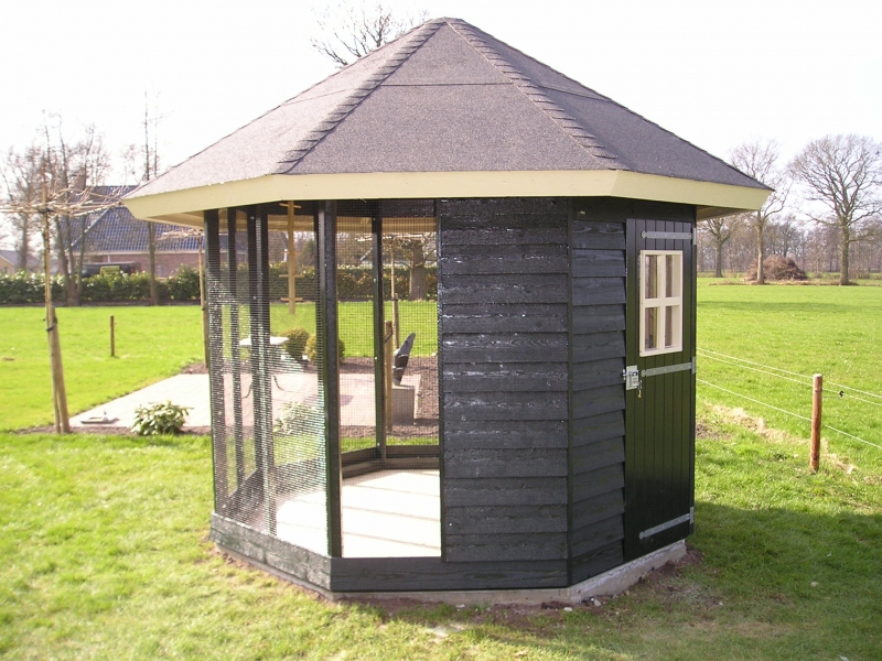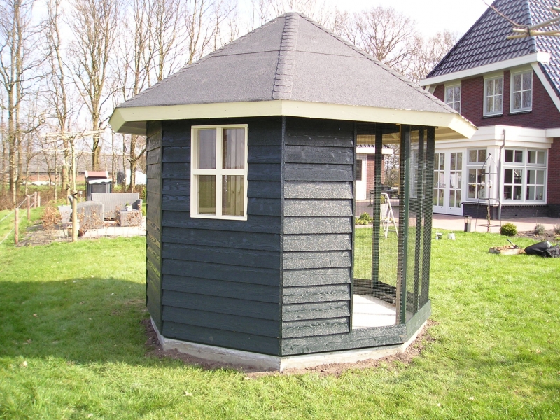 De buiten volière heeft een nachthok welke vogels via een nachthok kunnen betreden.
