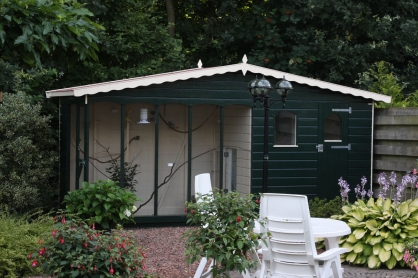 Grote en complete buiten volière van hout. De vogel volière heeft een afmeting van 450 cm x 150 cm. De sluis naar het nachthok heeft een afmeting van 150 cm x 90 cm en het nachthok is 150 cm x 110 cm.