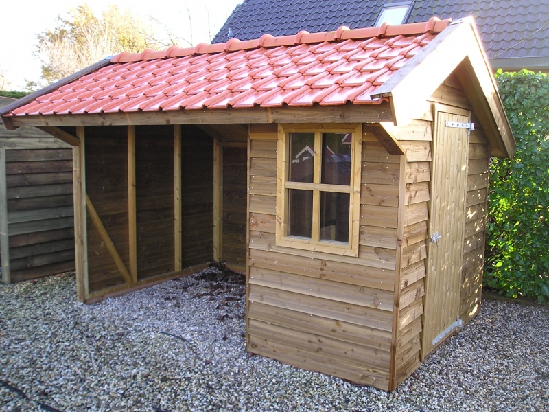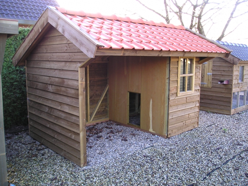 Groot schuilhok voor geiten met een aangrenzend nachthok. Het dak van het geitenschuilhok is bedekt met rode dakpannen. De afmetingen van het schuilhok zijn 325cm x 200cm.