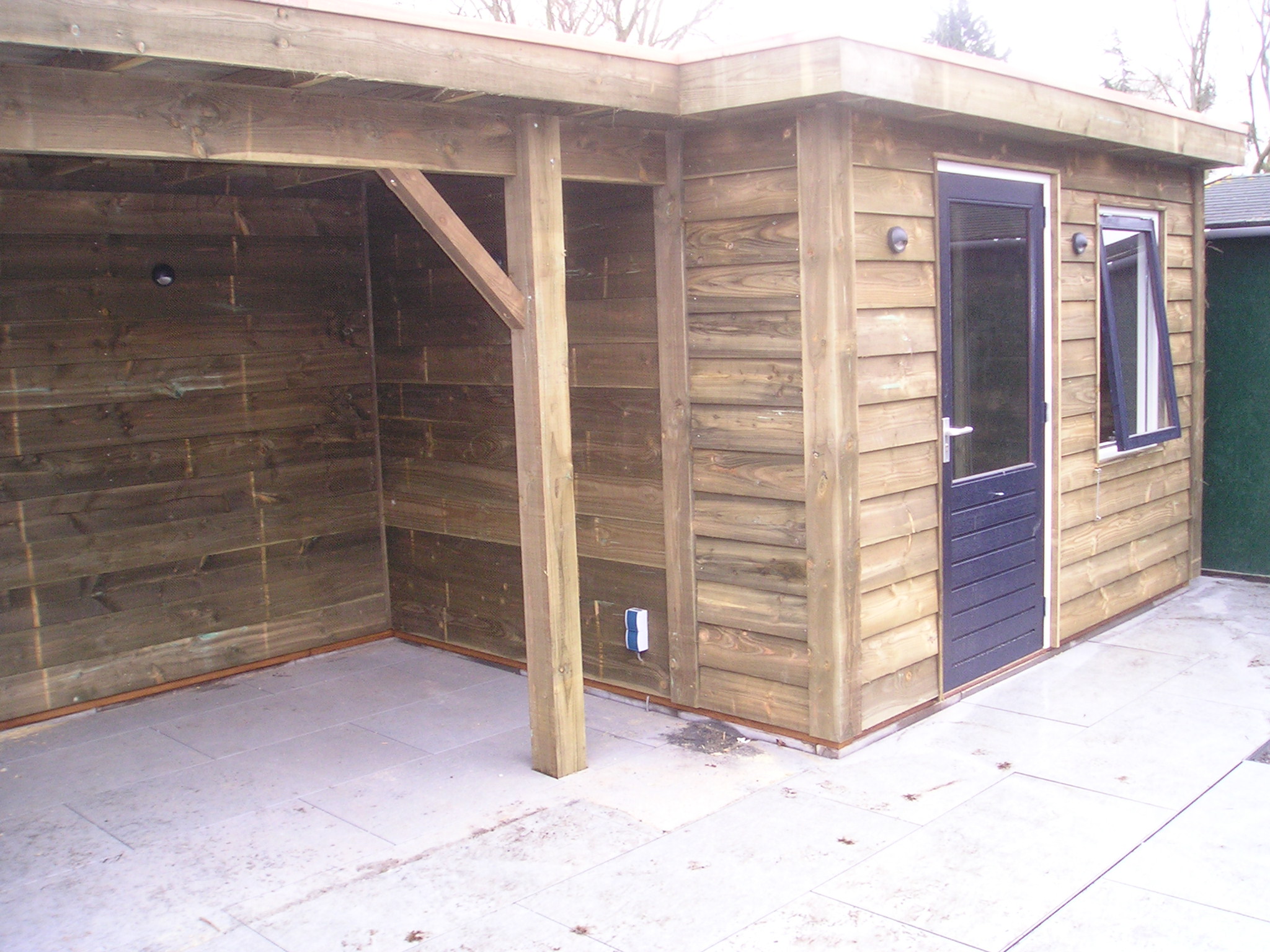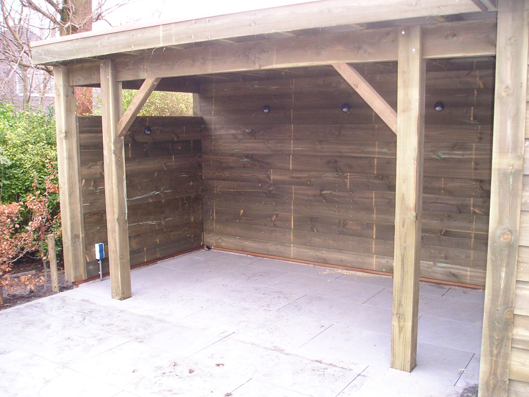 Deze berging met overkapping kunnen wij voor u ook op maat maken.
