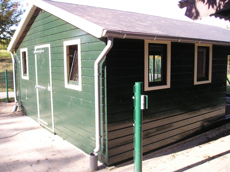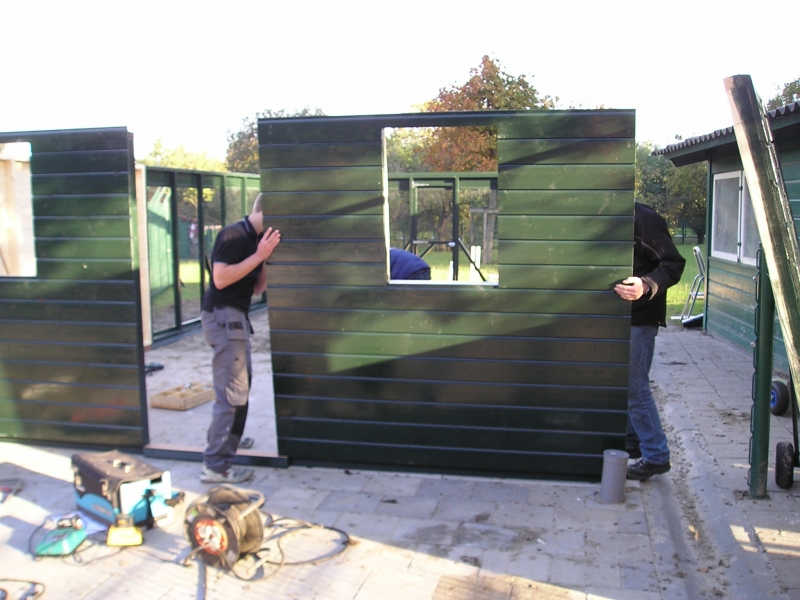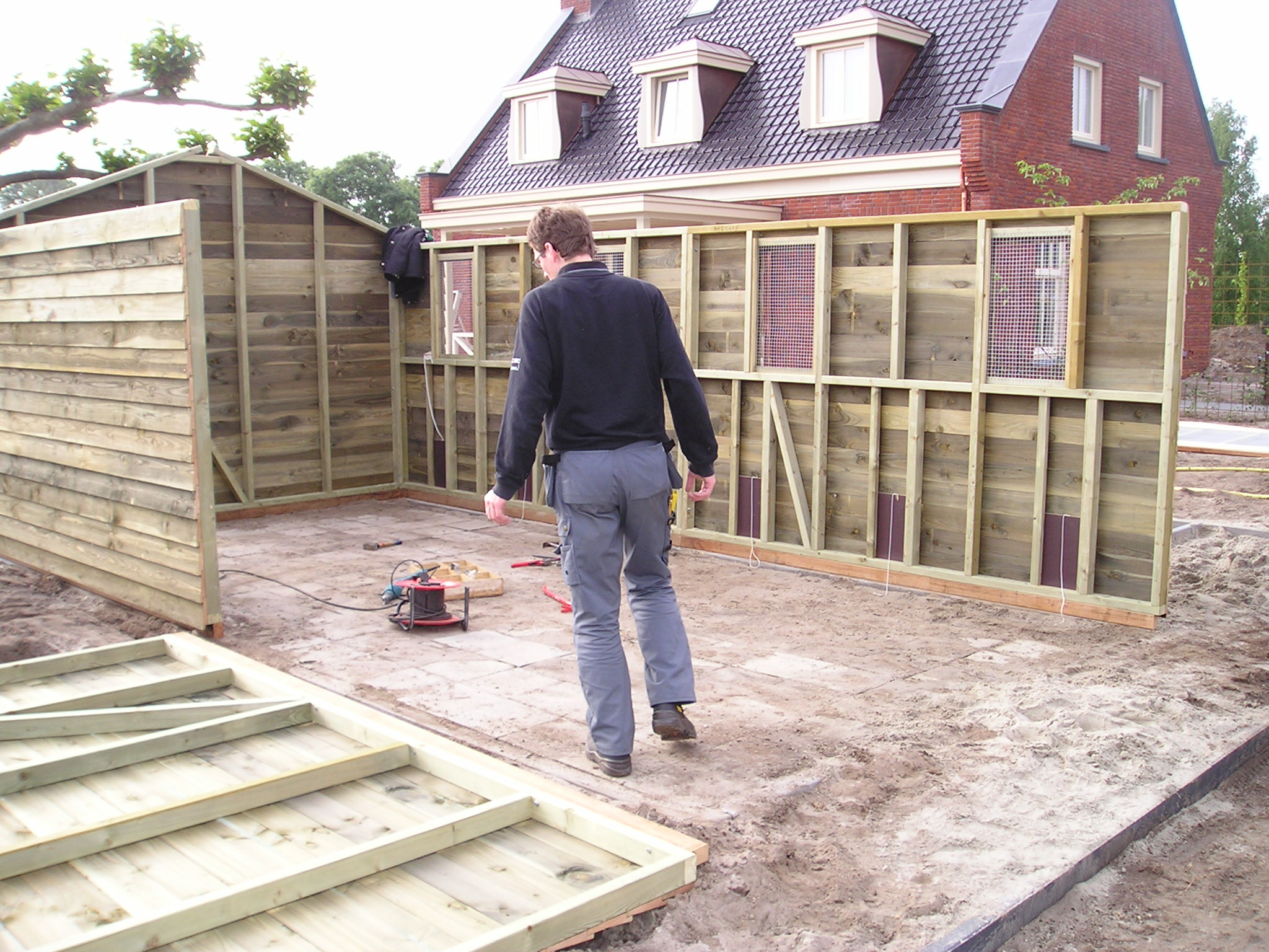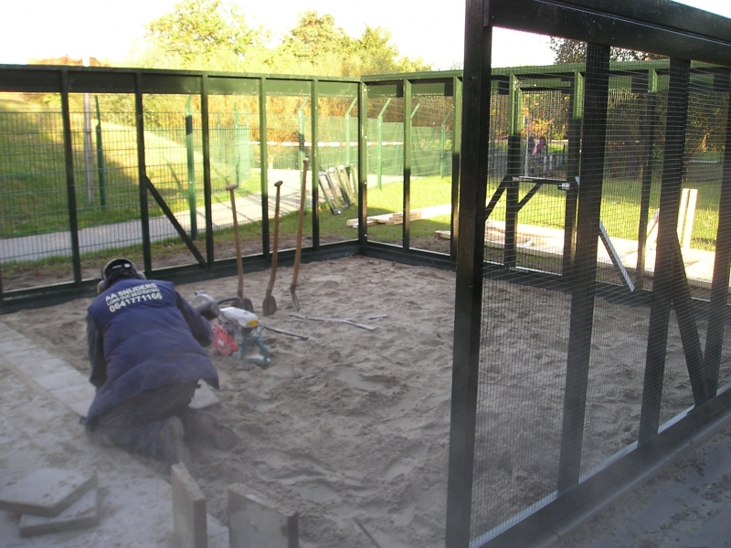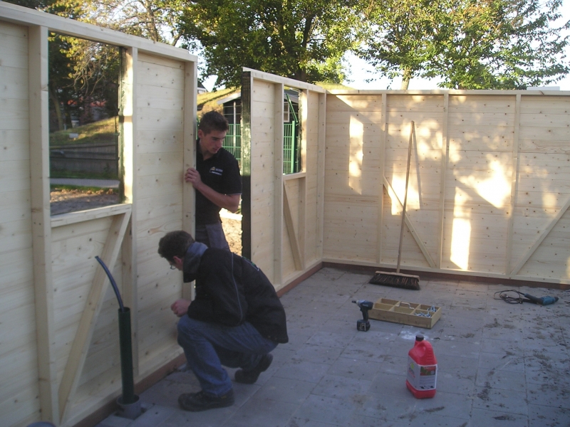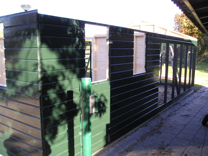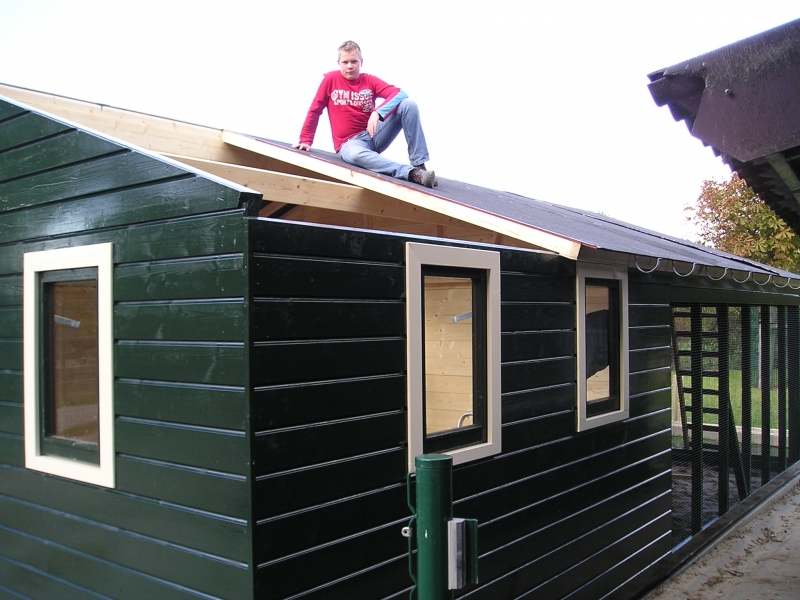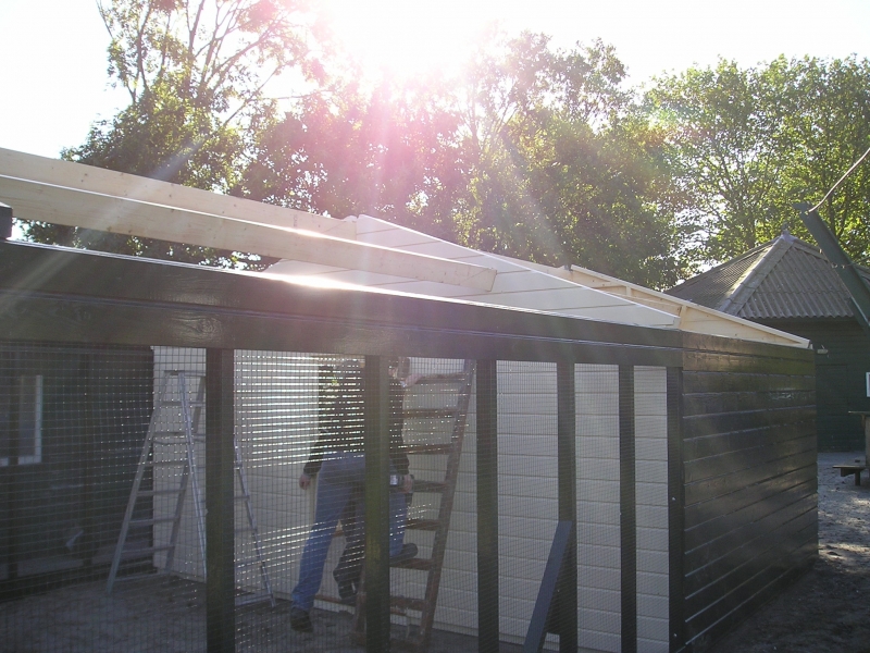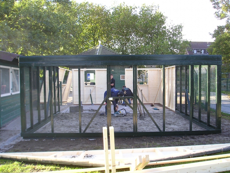Op de onderstaande foto's kunt zien hoe een dierenverblijf gemonteerd wordt. Wilt u ook een dierenverblijf? Wij leveren grote hondenhokken, kippenhokken, geitenhokken, konijnenhokken en voilères. U kunt bij ons terecht voor zowel standaard modellen als op maat gemaakte hokken. Neem contact op voor de mogelijkheden. Wij helpen u graag verder.